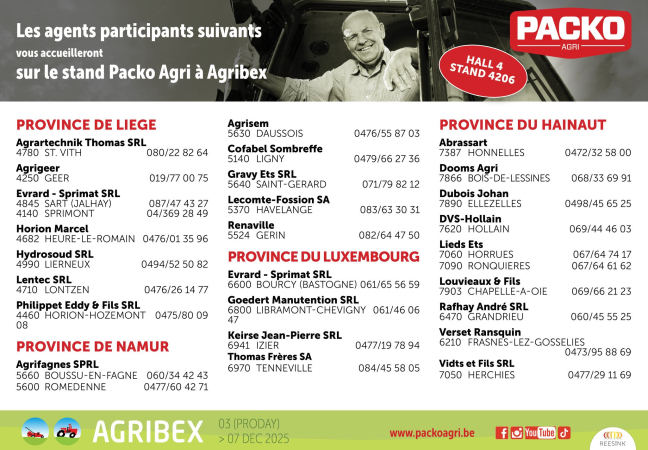 L’équipe Packo Agri est impatiente de vous accueillir avec le soutien précieux de certains concessionnaires. Découvrez ci-dessous les partenaires qui seront là pour nous aider à vous offrir le meilleur accueil et vous présenter une trentaine de machines Rendez-vous jusqu'à dimanche, chaque matin àpd 10 h (hall 4 – stand 4206).